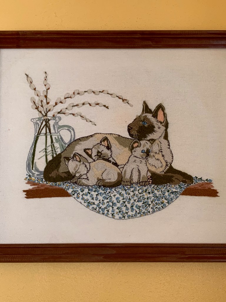 This dopey cat and kittens needlework project took 41 years to complete. Seriously. Let me explain.