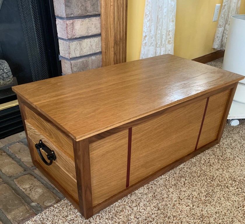 This was one of those projects that took me way too long. I started this chest ages ago and for whatever reason got distracted or lost interest and it got set aside and forgotten about until MrsGF got on my case about it. This was a gift for some friends of ours on their wedding anniversary and it went out to its new owners, finally, about a week ago. It turned out pretty good. It’s white oak trimmed with walnut edging and the vertical inlaid stripes on the front are purpleheart, with hand made wrought iron handles attached with brass bolts that I picked up somewhere. I’m rather pleased by how it turned out.