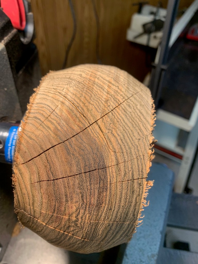After I did that video I got caught up in a few other things that absolutely had to get done so it sat on the lathe for a couple of days and when I came back that’s what it looked like. Lots and lots of nasty cracks. Not just surface cracks, either. They run almost all the way through the piece of wood. I’m a bit upset about that. That was a beautiful piece of wood and I paid more than $40 for that block. Why did it crack? I have no idea. It shouldn’t have. Usually you get cracks like this when a piece of wet wood dries down to fast. But my moisture meter said it was down to about 10% so that shouldn’t have been the problem.