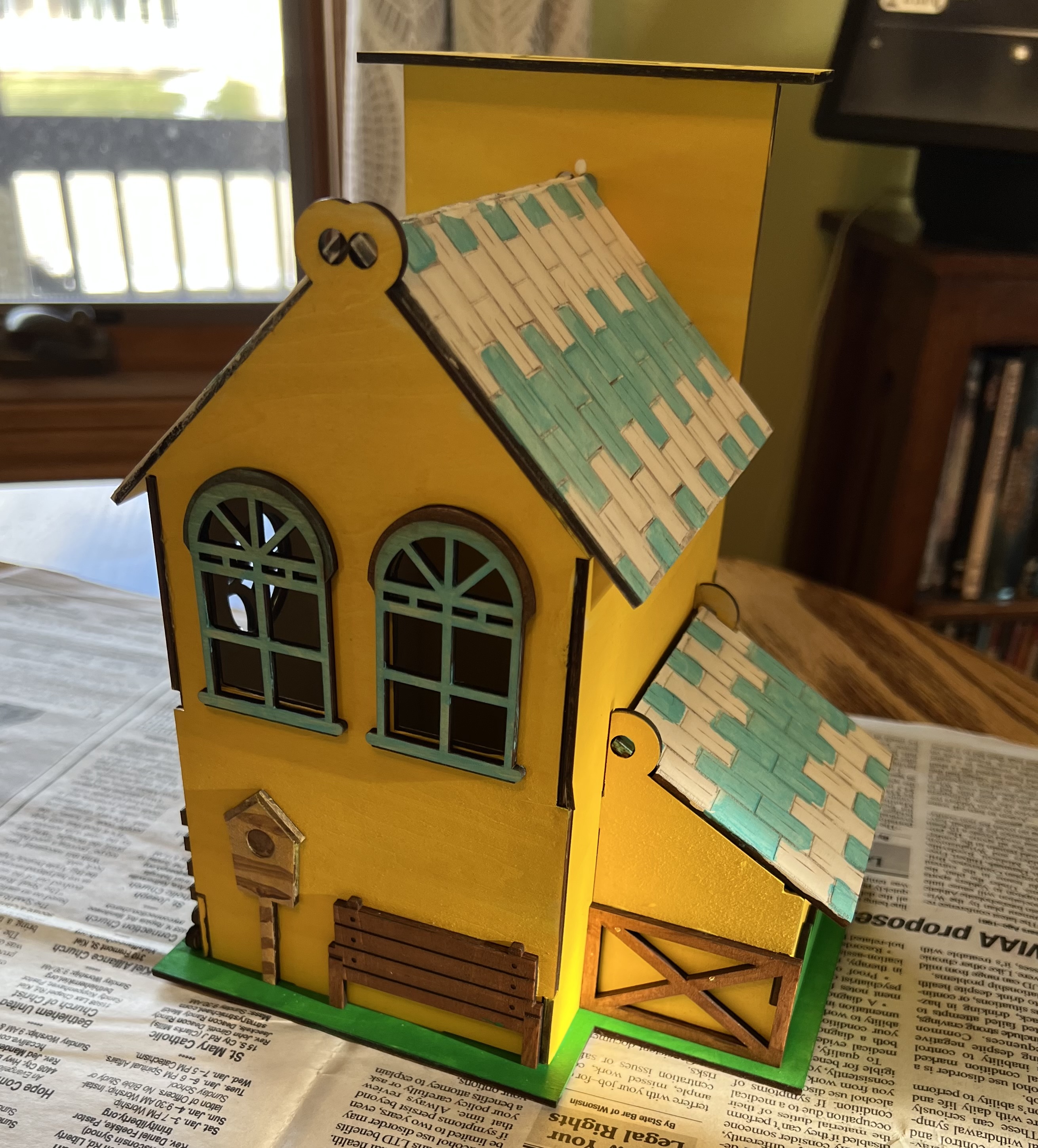 I’m having way too much fun with this laser stuff. I got bored the other day and found a project on the Crealty Falcon project collection that looked interesting so I loaded that up, ended up with a whole box full of misc. parts, sort of like a big 3D jigsaw puzzle, dug out a set of acrylic paints and glue and the next thing I knew I had this sitting on the table.