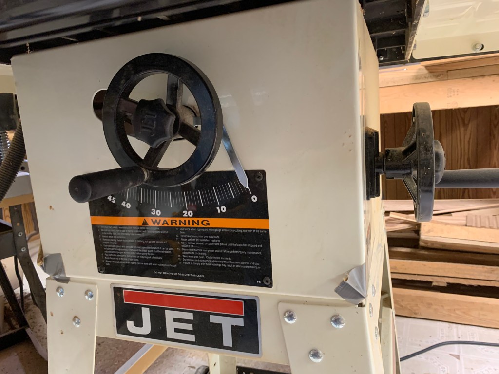 First thing to think about is the amount of space you have. These saws are big. They take up a lot of floor space. That’s my 15 year old Jet saw in that photo up there. It is 3 feet deep and 5 feet wide. So it is physically large. Plus you need enough clear space around it so you can work safely. If you want to rip a 6 foot board, for example, you need at least 6 feet in front of that saw, and 6 feet behind that saw, in order to slide that board through the saw. So you really need a minimum of at least around 14 – 15 feet. Cross cutting isn’t quite so bad. You’re almost never going to try to cross cut a board more than a few feet long.