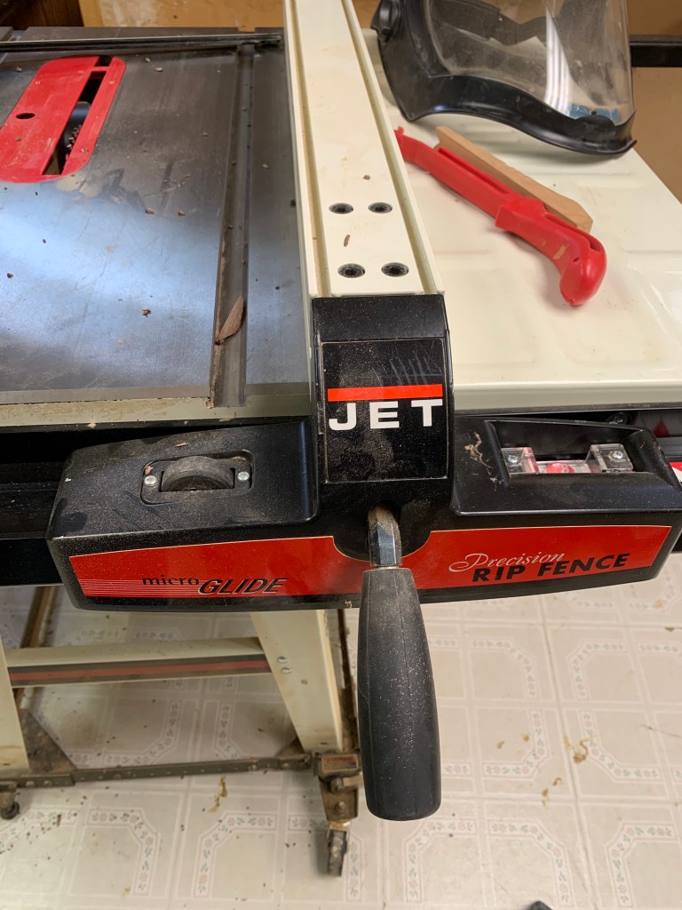 No matter what you call ’em, this style saw is a full sized table saw with a pretty hefty motor, usually 120V but often the motors can be rewired for 240 if you want, good sized tables that will handle just about any normal sawing job you need to do. And generally it has an open frame holding it up like my Jet up there in that photo and not a fully enclosed cabinet base, although as I noted, some are now coming with enclosed cabinets. It’s going to have a 10″ saw blade, a tilting arbor, hand wheels on the front and/or side to raise and lower the blade and to change the angle of the blade, a pretty good quality rip fence, a miter gauge that is most likely a piece of junk and should be replaced with one that is actually accurate and safe, and, of course, safety gear designed to keep you from cutting off bits of your body while using the saw, like anti-kickback devices, a riving knife, shield over the blade, etc, and a flat (hopefully) machined heavy steel or cast iron table with side wings to support larger pieces of wood.