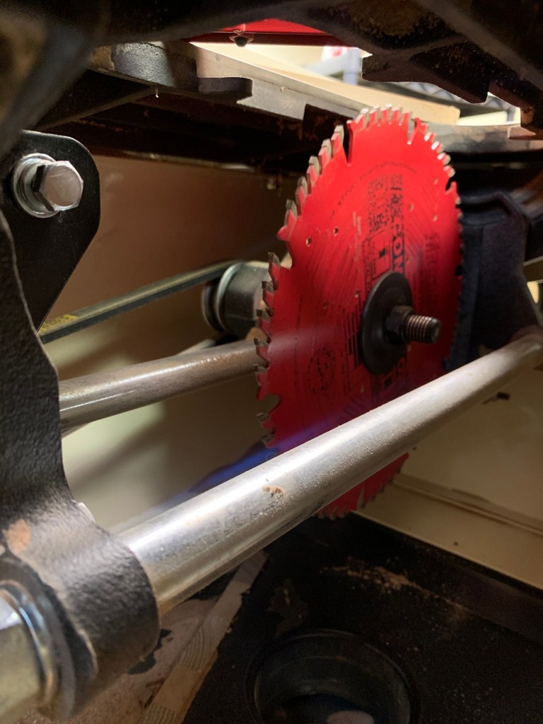 The arbor is the shaft that the blade itself is bolted to which, in turn, is mounted on an assembly that permits the arbor and blade to be raised and lowered and tilted. The arbor should look and feel sturdy. There should be absolutely zero play when you try to move it, especially not in the bearings nor in the lifting and tilting mechanisms. Reach in there and grab the saw blade (carefully) and try wiggling it back and forth. The saw blade may flex, but ignore that. If the arbor, the bearings, the shafts, anything under there wiggles, moves, shifts position, makes clicking noises, anything that doesn’t seem quite right, avoid that saw like the plague. If any of that equipment down there isn’t absolutely perfect, you’ll never get that saw to work right.