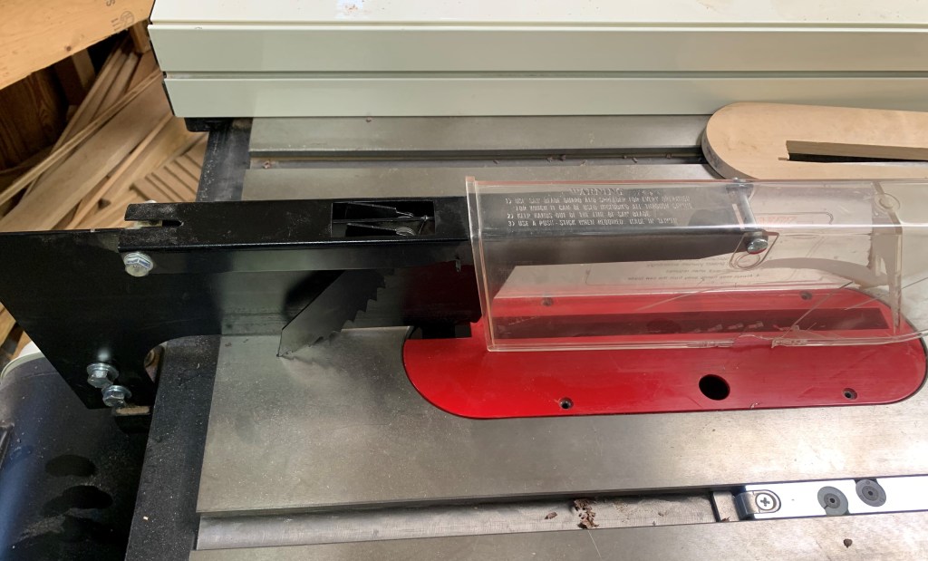 Then there is the safety equipment. All saws will come with at least the minimum, which is some kind of splitter or riving knife to keep the wood from pinching on the blade, anti-kickback devices of some kind, and a shield over the blade.