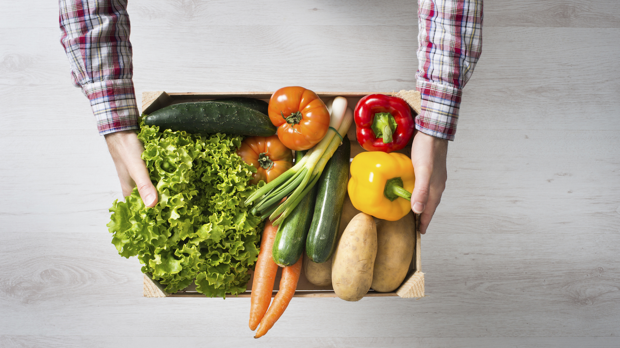 Previous Image Next Image Farmer’s harvest Farmer holding a wooden crate filled with fresh harvested vegetables from his garden