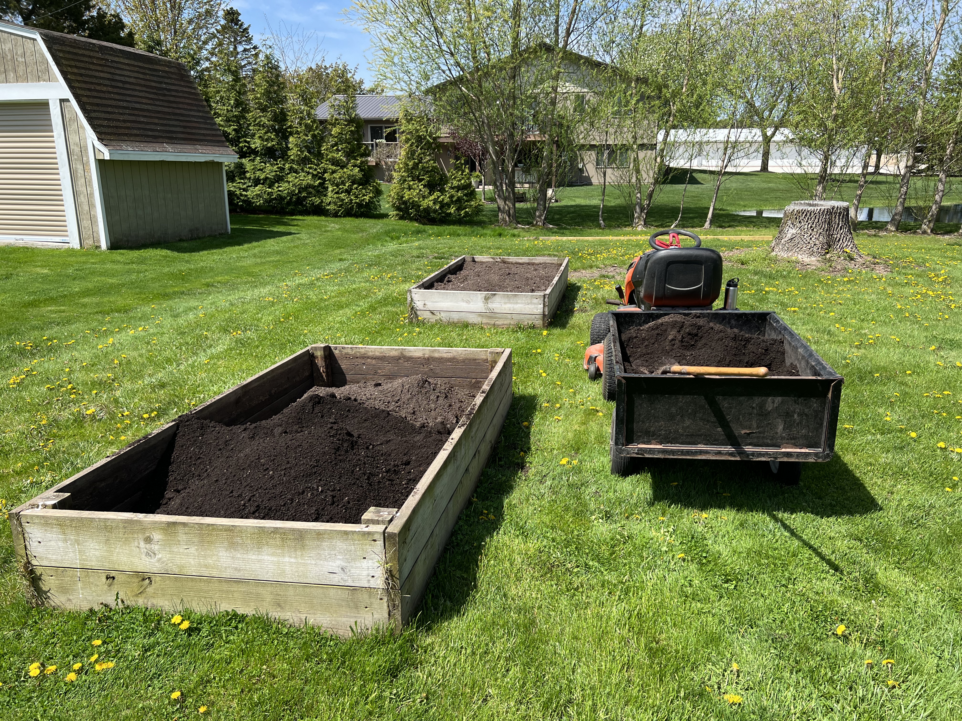 We moved the two raised beds from the north side of the backyard to the south side. In the previous location they were starting to get shaded out by a fast growing maple tree and a spruce tree. Growing conditions there were getting worse every year. Now that the ash tree is gone the area where we moved them now gets full sun all day long. Moving them was simple but took a lot of physical labor. Had to shovel out all of the dirt in them, drag them over to the new location and then shovel all the dirt back into them.