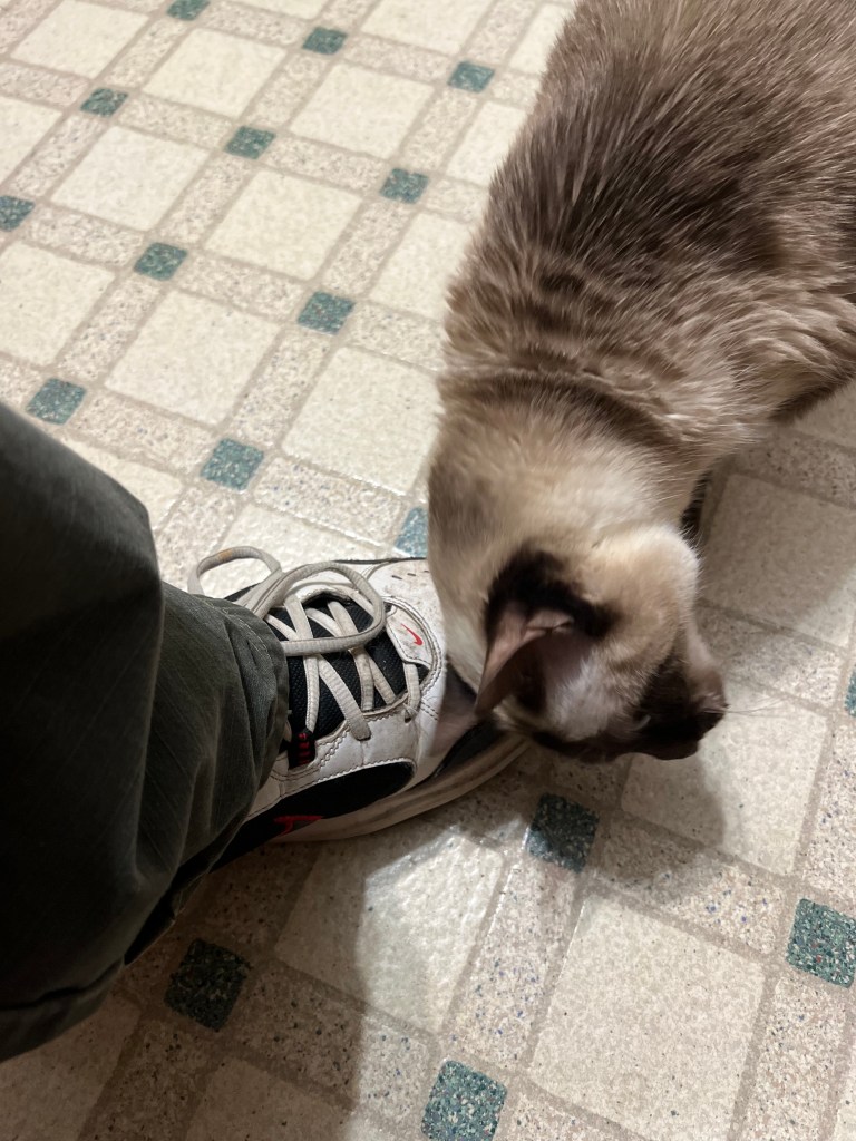 Meg, we’re not sure how old she is but she’s at least 16, maybe 17, and an absolute sweetheart. This foot rubbing thing is fairly new with her but I’m told it isn’t uncommon with kitties. She’s turned into quite the lap cat. If there is a lap anywhere in the house, she will find it and sit on it. She has this thing now where when she’s on my lap she likes to climb up on my chest and rub her face in my beard which is cute but that cat’s claws are like little razors and when she gets relaxed she starts doing this kneading thing it gets a bit interesting.
