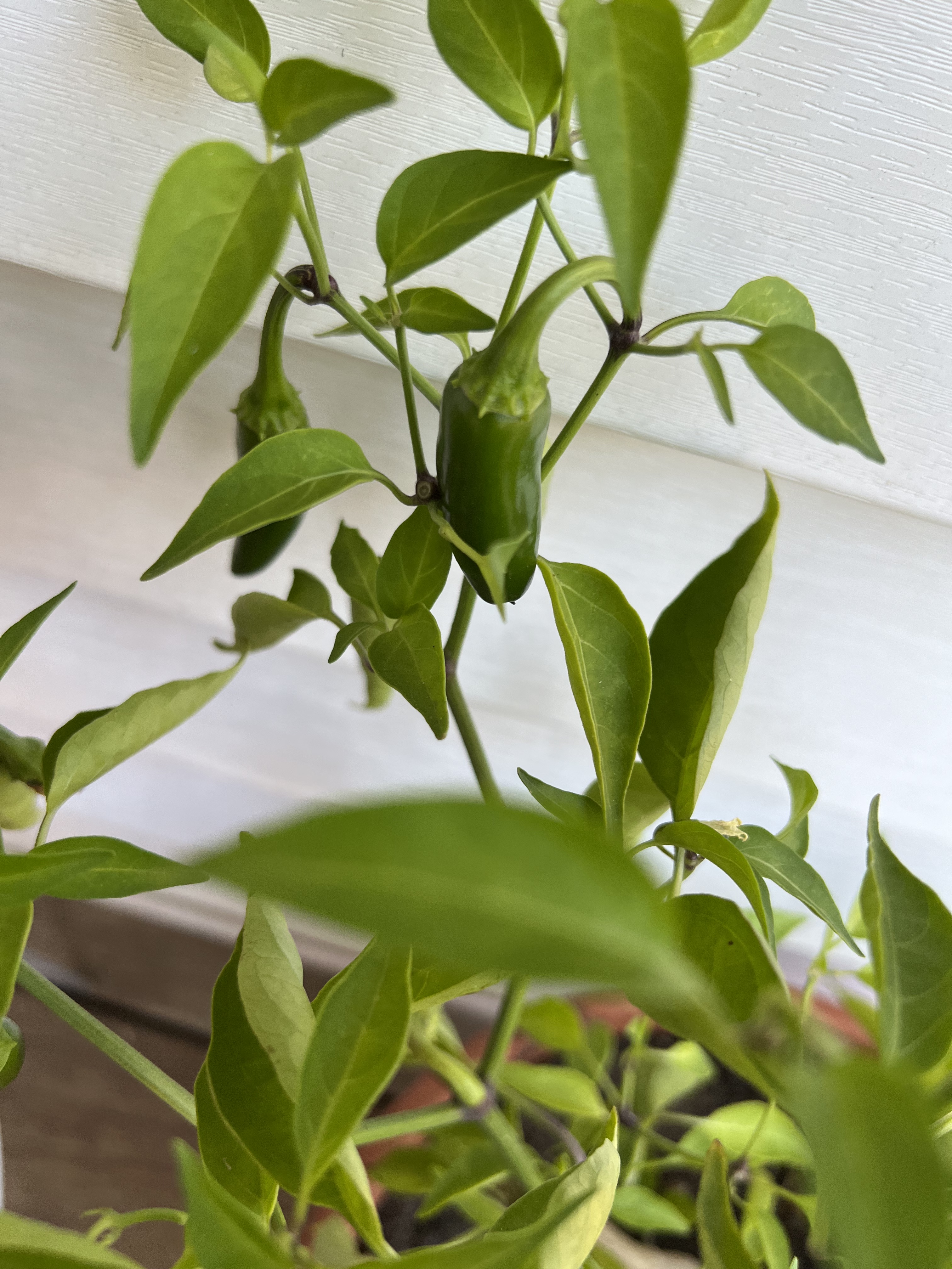 The tiny red one is actually supposed to be a jalapeno. I don’t know what happened to it. The ones in pots up front are just funny looking. Taste good, though. I associate tiny, tiny red peppers with intense heat but that one up there was relatively mild, even sweet.