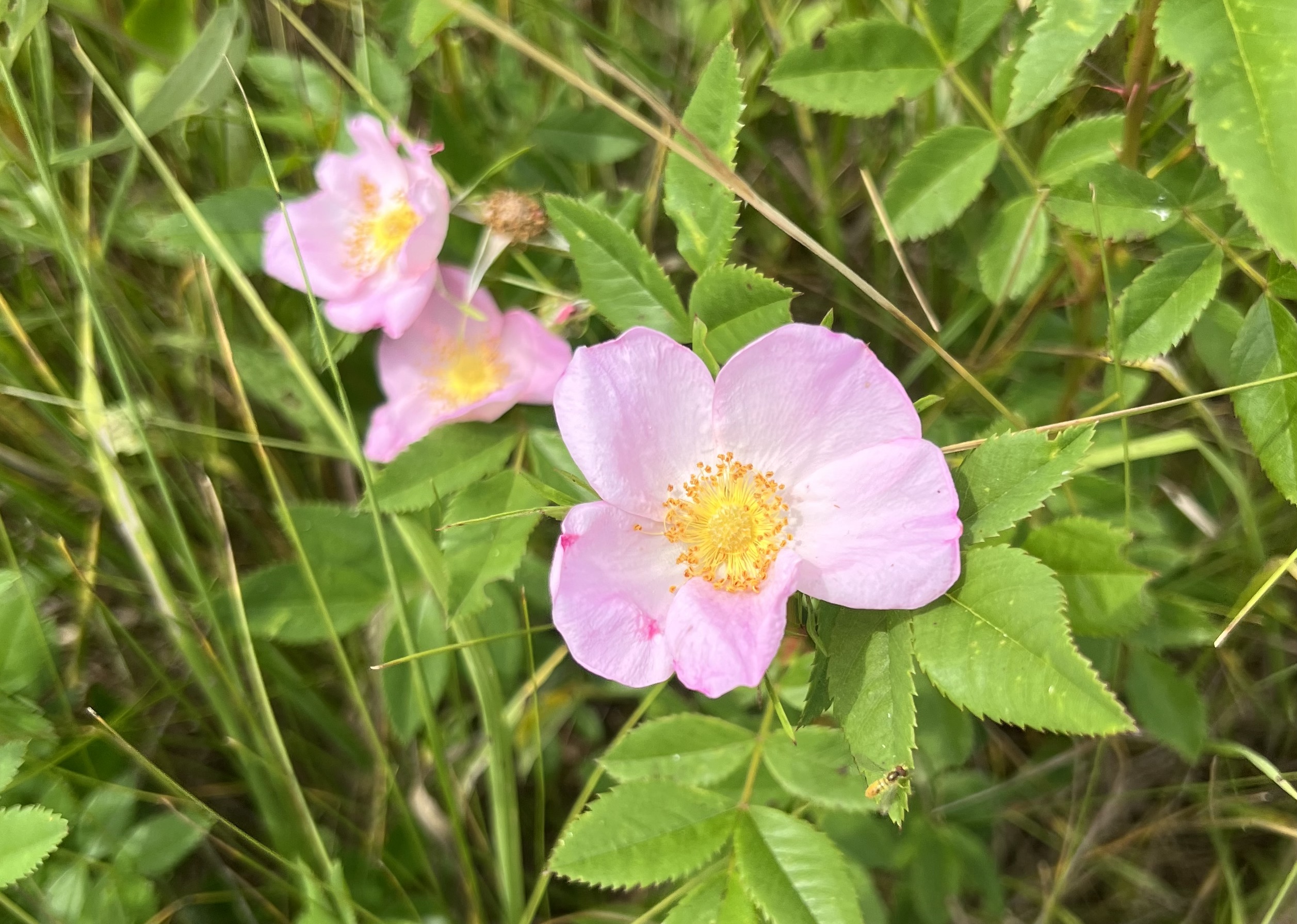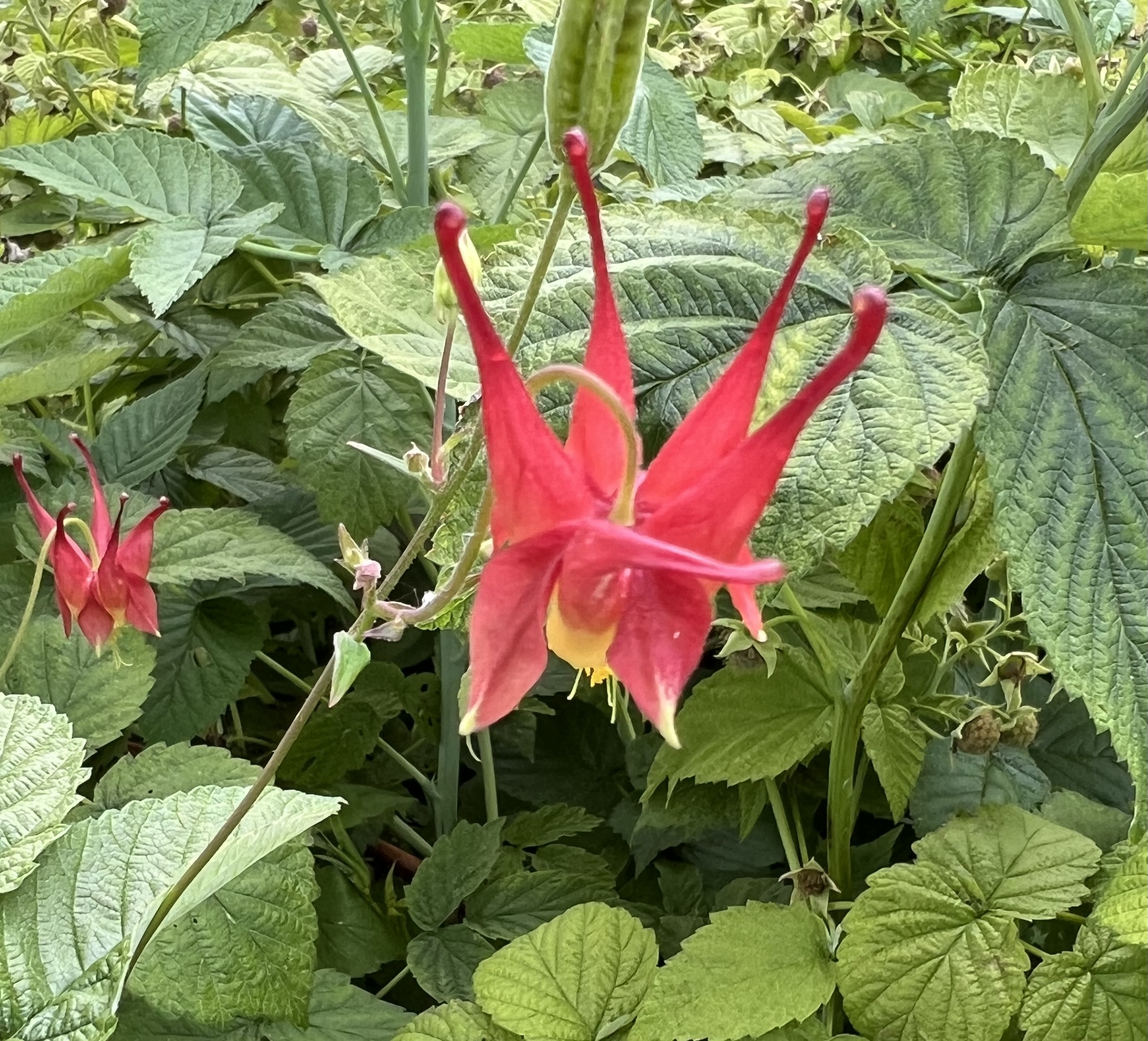 Mr. Spiny the cactus is doing beautifully this year. Brilliant flowers for a week now.The poppies, like dill and a few other things in the garden, come up by themselves every year. I’m not a big fan of these. The flowers are beautifully colored but they only last a day or two. This little guy was one I found along the side of the road out in the country when I was on the bike the other day. Google tells me that it’s a type of rose.Columbine is another volunteer that keeps coming back year after year. Very pretty flowers but the darn things spread like weeds in the garden, usually turning up where we don’t want them.