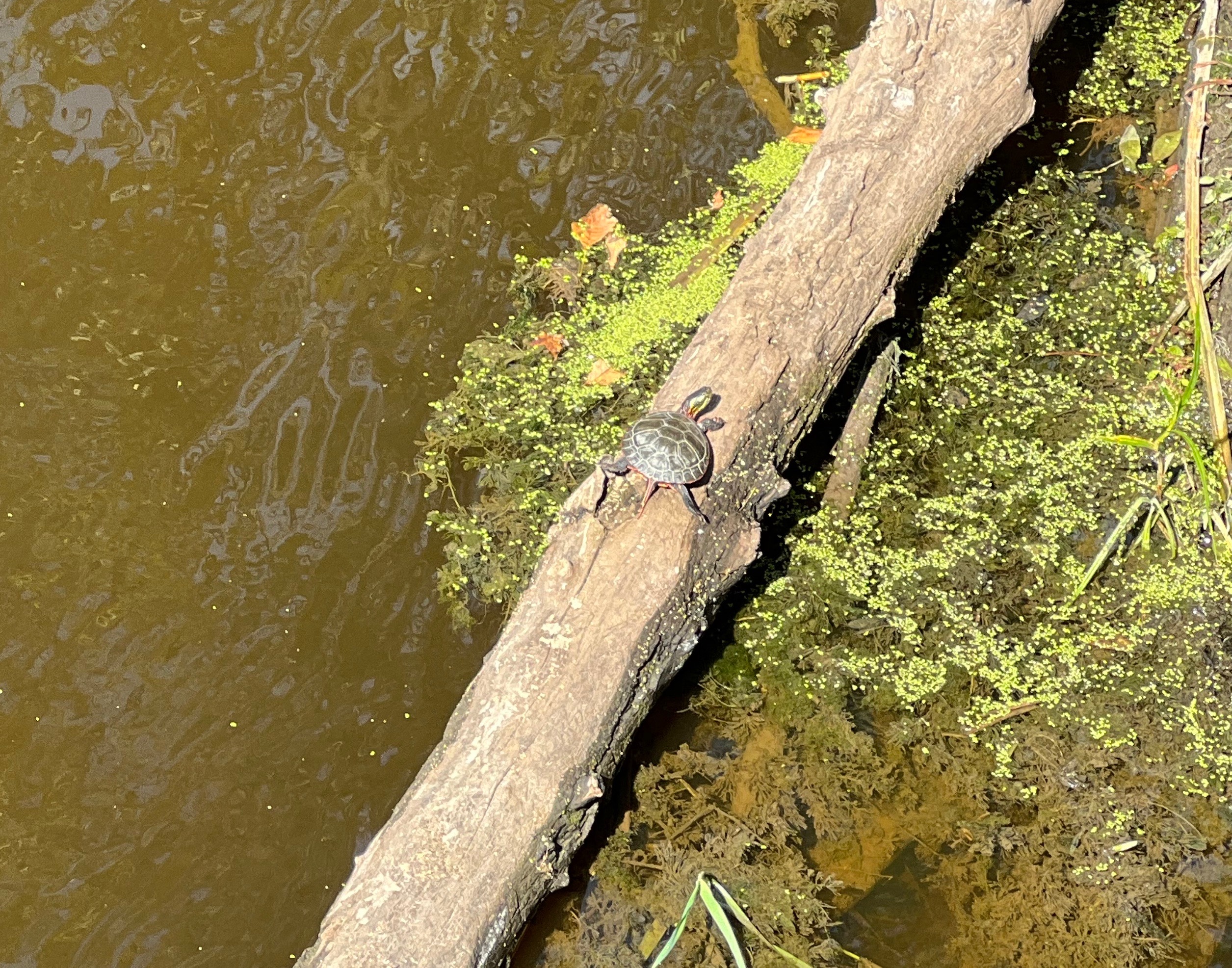 And turtles. Seeing turtles around here used to be pretty rare. In all the hours I used to spend in the woods and along the rivers and creeks when I was a kid and teenager, I never, ever saw a turtle. Or a snake for that matter. But in the last few years there seems to have been an upsurge in the number of reptiles and amphibians around here. We have frogs all over our backyard, there are massive bull frogs in the neighbor’s pond, tree frogs in our bushes, toads in the undergrowth. I’d never seen a tree frog in my life until just a few years ago. Now we got these guys hanging around here. This little guy was sitting up on the window shutter outside the house one day and scared the heck out of me.