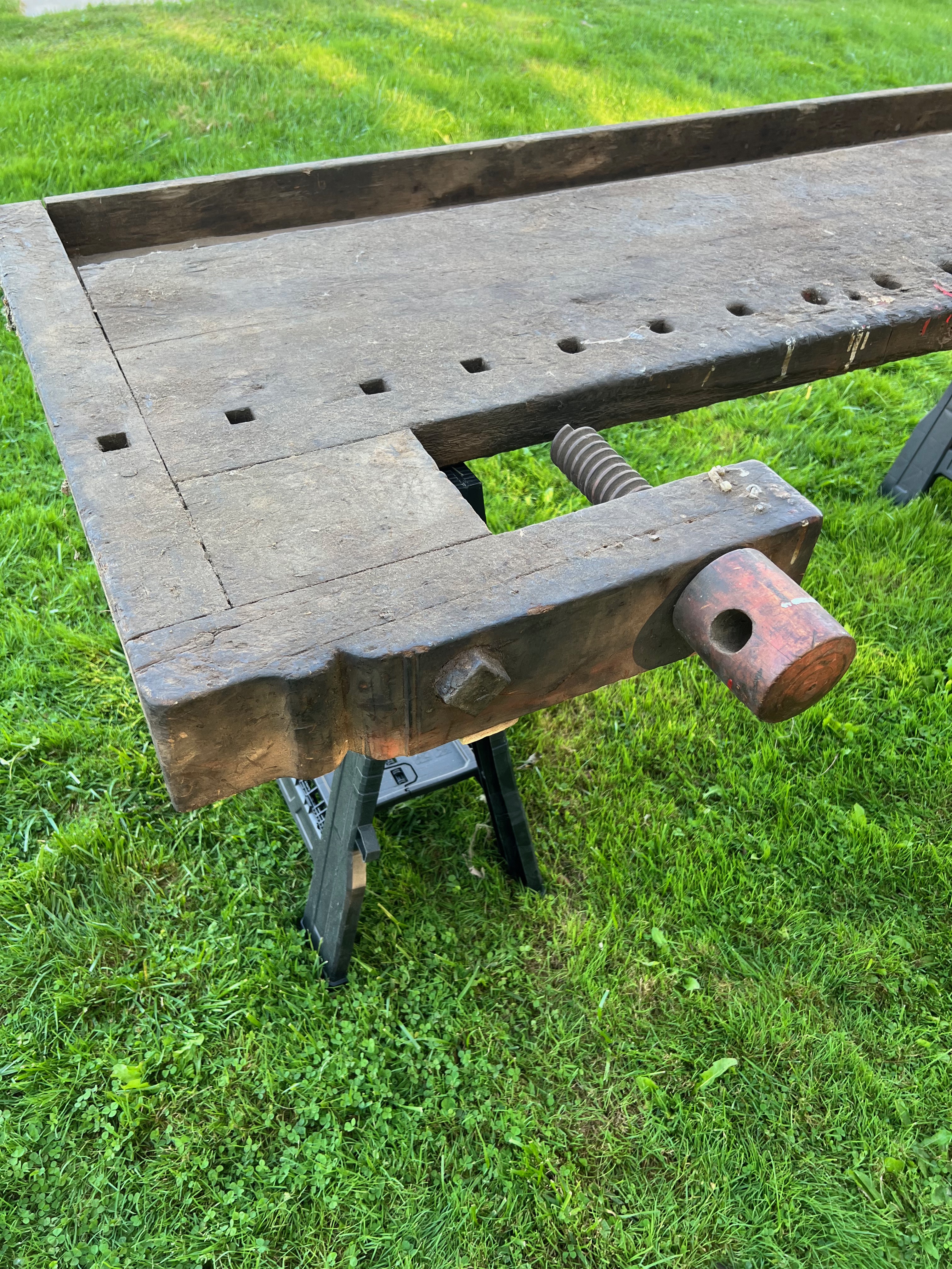 This thing wasn’t just a slab of wood on legs, either. This thing was a rather elaborate and very well made workbench for a woodworker or carpenter, and hand a lot of fancy features. And it was obviously made by someone who knew what they were doing with dovetail joints, scrollwork, those wooden screw vises and other goodies. And it is massive and very, very heavy. The top is one solid, 3 inch thick piece of hardwood. My son and I got it out of the garage where I’d been storing it yesterday and set it up on sawhorses so I could start working on it, we we figure it has to weight at least 200+ pounds.