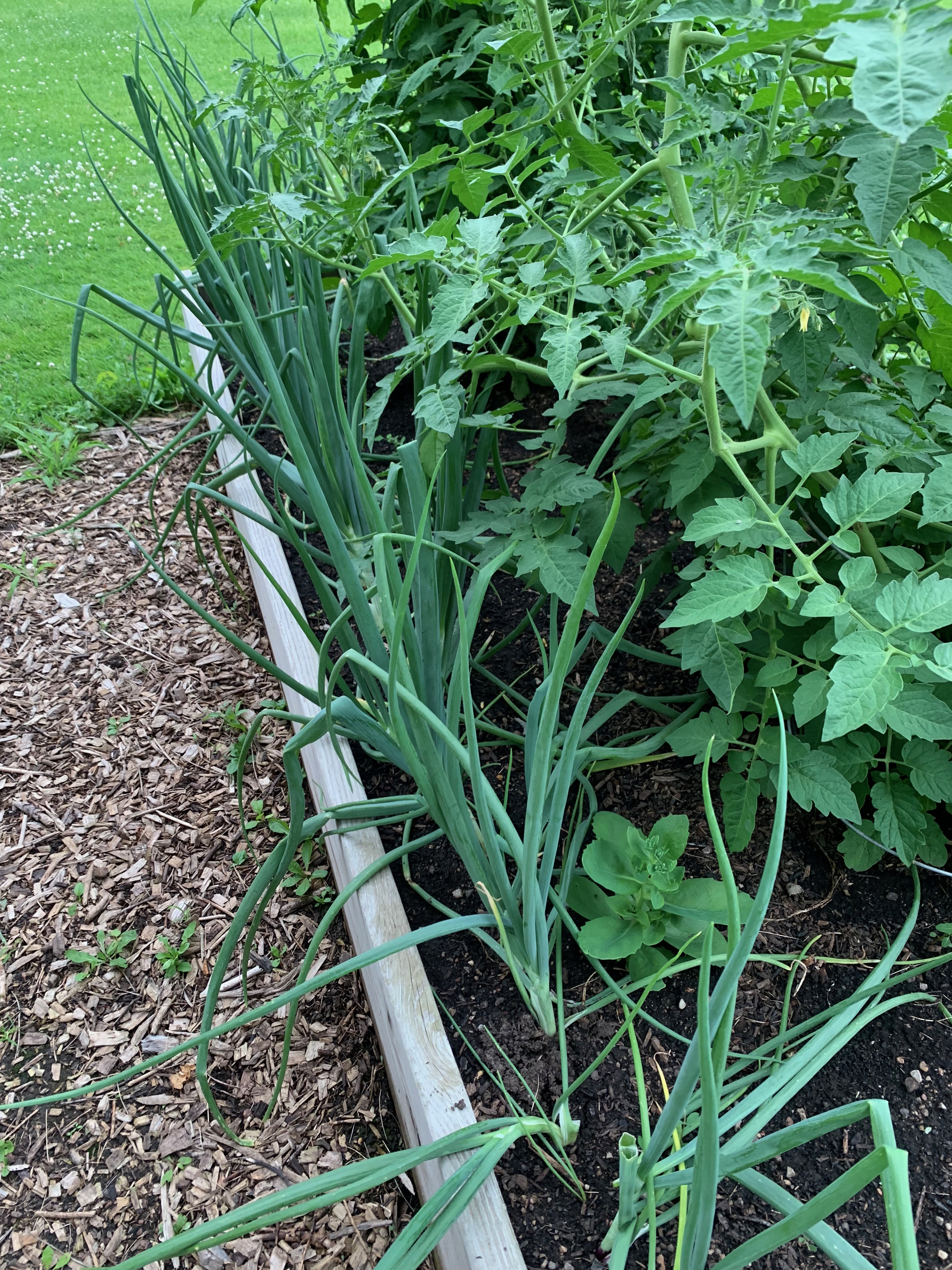 We tucked onions into the edges of the raised beds around the tomatoes this year as an experiment and it’s worked way better than we ever hoped. They’re absolutely beautiful. It’s a mixed variety of red, yellow and white onions, and they’re all doing well. Bulbs are about 2 inches thick and they taste amazing.