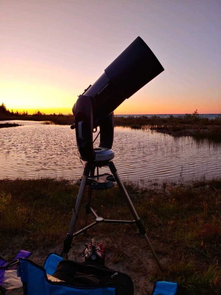 Eldest son and his girlfriend took a short vacation way up along Lake Superior where the air is clear and there are no lights, and asked if they could take the big 11″ Celestron telescope along. I was glad to let them have it. The poor thing has been sitting under its cover in the closet for an embarrassingly long time. I love the scope but the thing is huge and heavy (the tube assembly weighs around 60 lbs). It’s almost impossible for me to lug it up and down the stairs and maneuver it through the doors to get it outside. And when I do get it outside the air quality here has gotten so bad and we now have so much light pollution from streetlights, houses and businesses that it hardly pays to even bother taking it out at all.