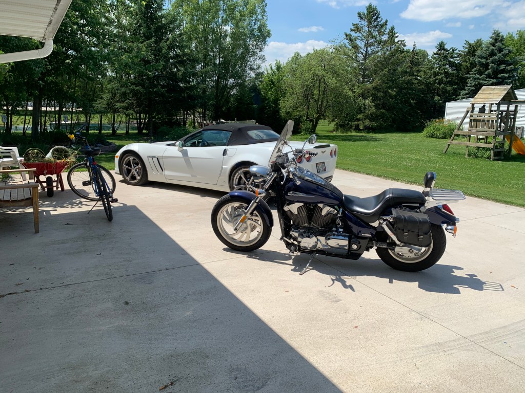 I finally got the motorcycle out the other day. It had been sitting parked in front of the car for ages. Had to get a new battery for it and it started right up so I ran it around town for a while. MrsGF and I used to really be into motorcycling, especially long distance touring. We used to have a BMW that we spent weeks on every summer. Then we traded that off on a Goldwing. But around that time she started having problems with her knees and it was really hard for her to get on and off the bike, and well, we put a whopping 5,000 miles on the Goldwing in three years so it didn’t make sense to keep it. So I worked out a trade with my son and he’s got the Goldwing now and I have this VTX to run around on when the urge strikes me.
