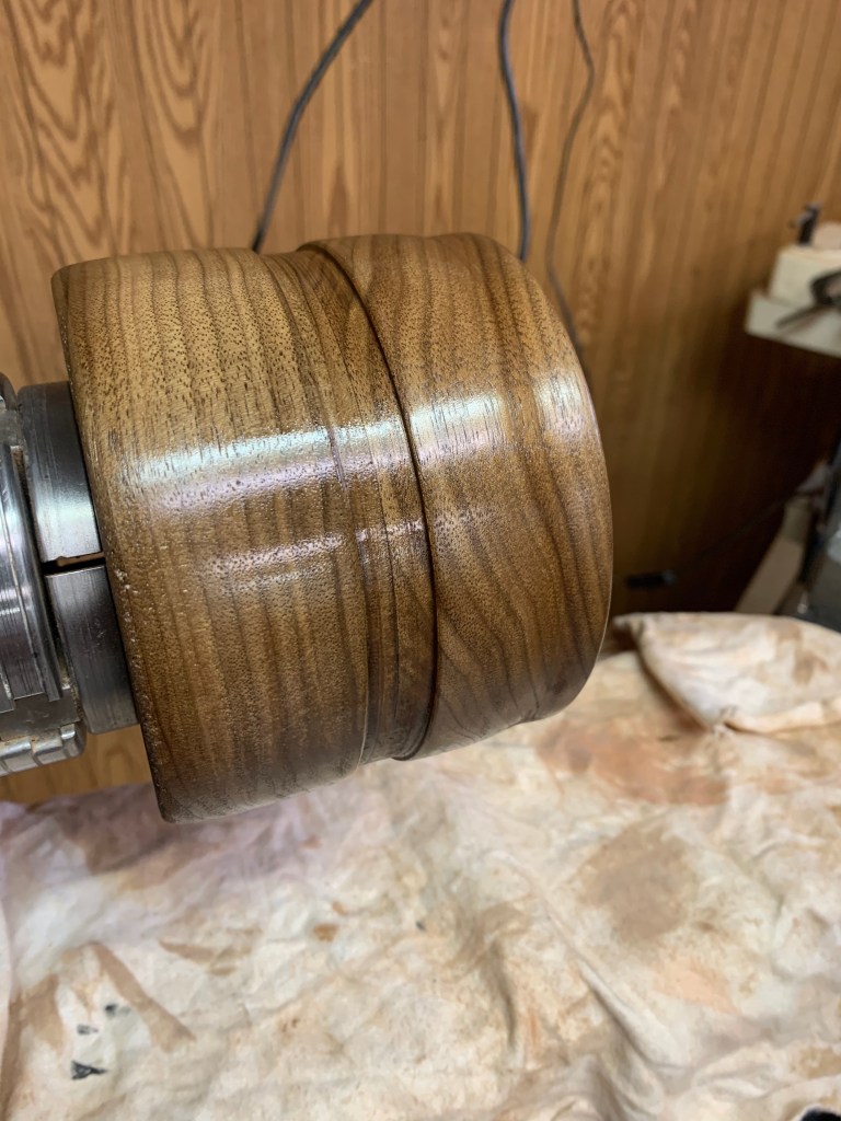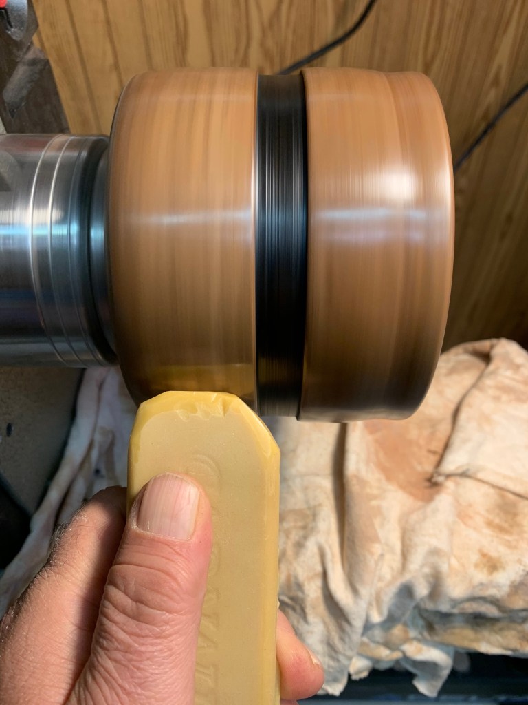 This leaves a deposit of wax on the bowl. Then I turn up the speed on the lathe and buff it out with a clean cloth.