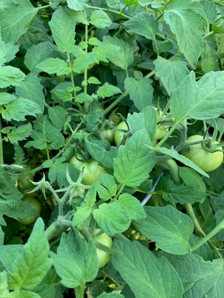 I don’t think I’ve ever seen our tomatoes look quite this good. The plants are amazingly lush and have gotten absolutely enormous. The two Wisconsin 55 plants are about 4-5 feet across and would be probably 4 feet tall if the weight of the fruit wasn’t pulling the stems down. The tomato cages have proven woefully inadequate and have started collapsing. It’s ridiculous. The other variety we planted are Early Girl, a smaller tomato, but they’re just as lush and prolific as the 55s are.
