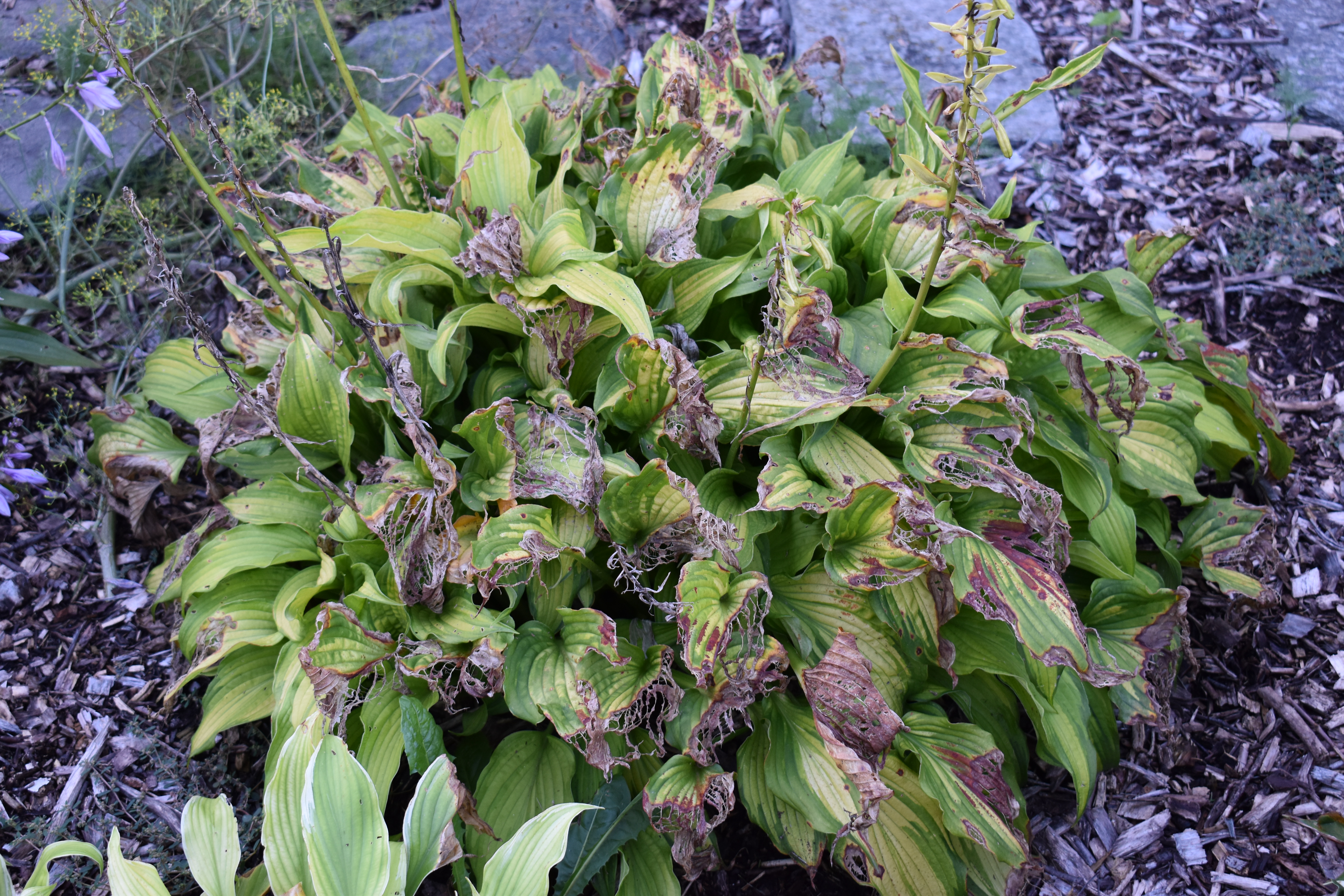 The giant large leafed varieties did a lot better than the more traditional looking narrow leafed types. The variegated varieties seem to have fared worse than the solid colored ones. This time of year the hostas start to look pretty rough anyway. They’ve all flowered now and are going to seed so there is no need for them to keep putting energy into the foliage, I suppose. They’re getting ready to go dormant for winter anyway.