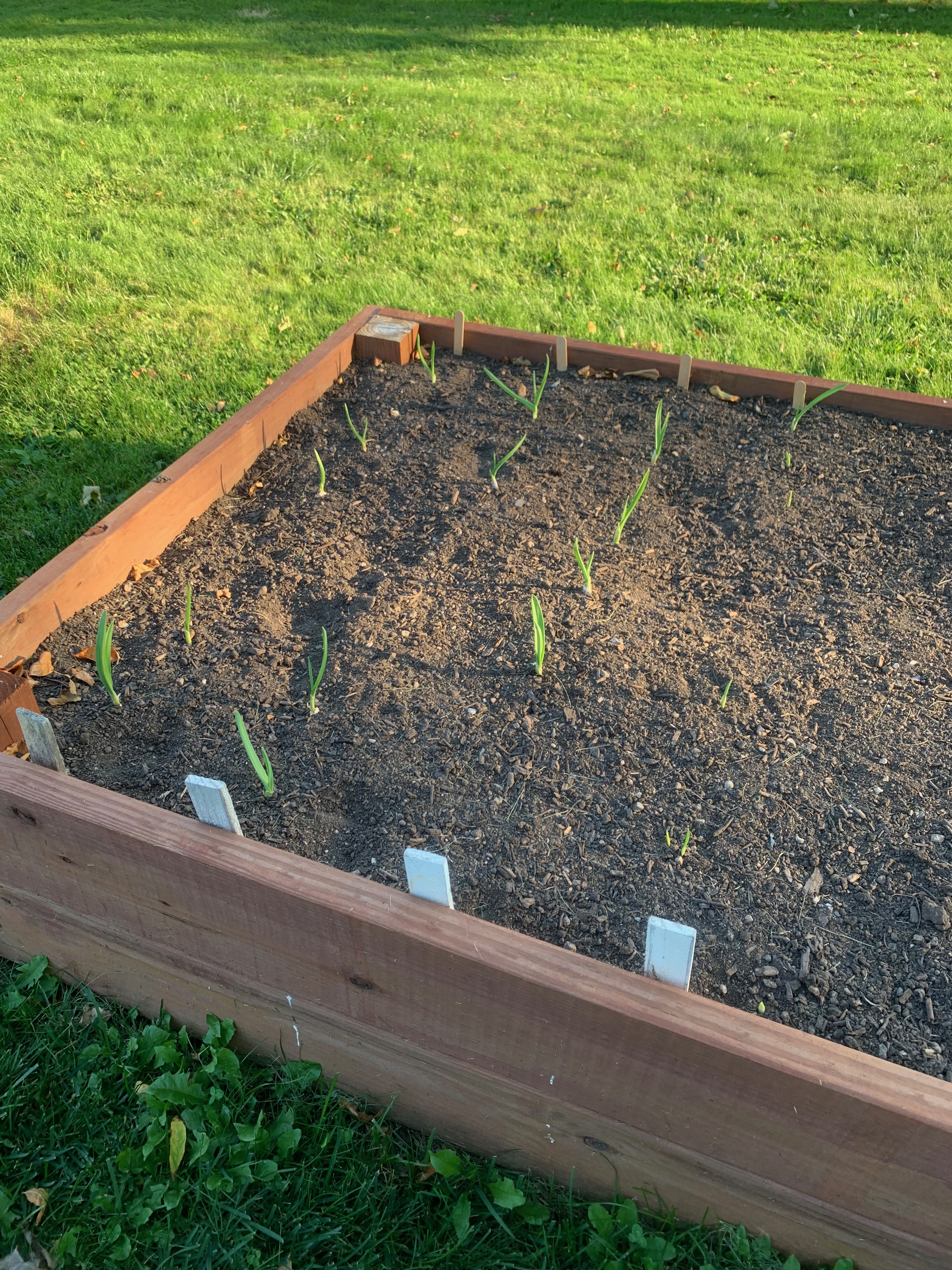 We’re experimenting with growing garlic. We use a lot of the stuff in cooking but the quality of garlic we get from the local stores isn’t very good. Usually the bulbs we find in the stores have obviously been in storage for a long, long time and has lost a lot of its flavor. We’ve tried growing garlic before and we weren’t very successful. One batch of ridiculously expensive organic garlic we planted didn’t even sprout. One batch we tried did grow, but the bulbs were disappointingly small. The stuff tasted so intense and so good though, and so much better than what we were buying that we still want to try growing our own. So half of one of the raised beds is now in garlic. Once cold weather hits the bed will get covered with mulch to protect it, then that will be removed in the spring and hopefully in mid to late summer we’ll have garlic.