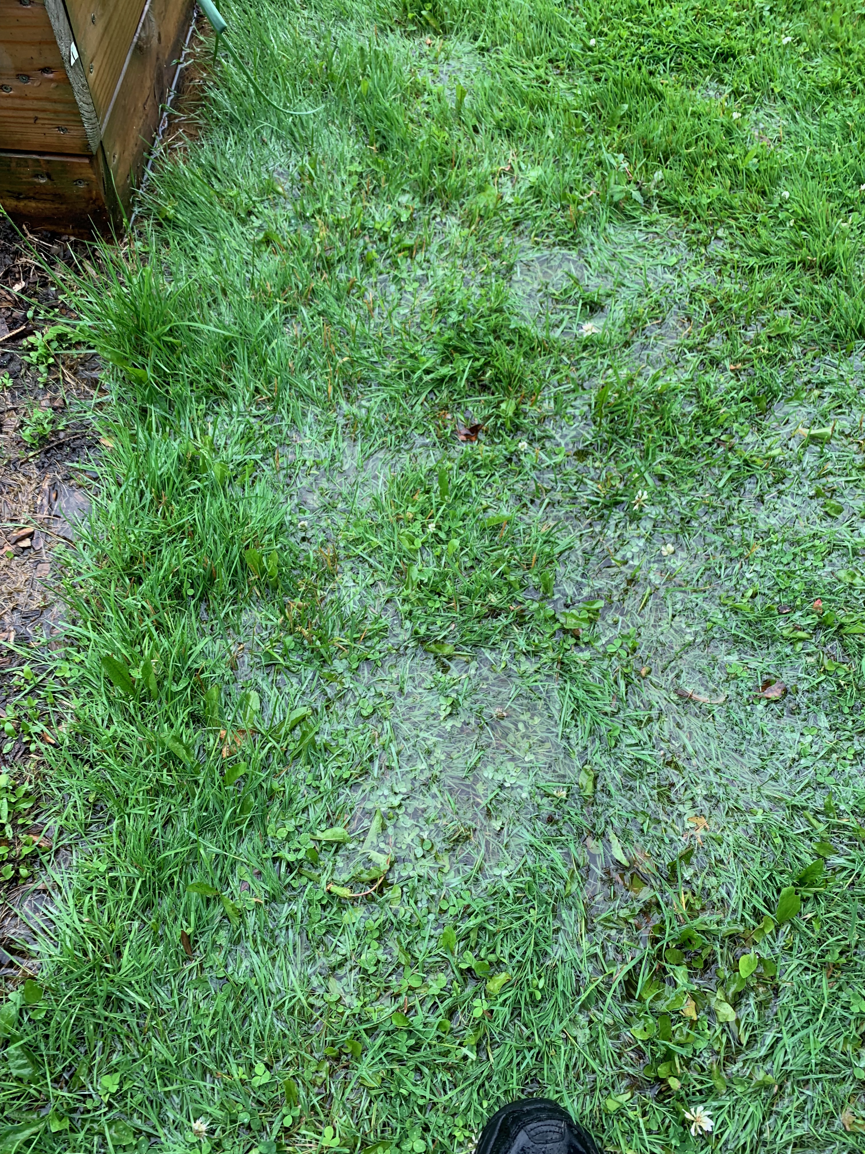 And then, of course, there’s the water. Oh brother… The ground is still so saturated that you can audibly hear it squishing when you walk through the grass. And the whole area back by the raised vegetable beds still had standing water under the grass as you can see in that photo. If we didn’t have the raised beds nothing would be growing back there this year. I don’t think we’ve gone more than three days in a row without significant rainfall since April.