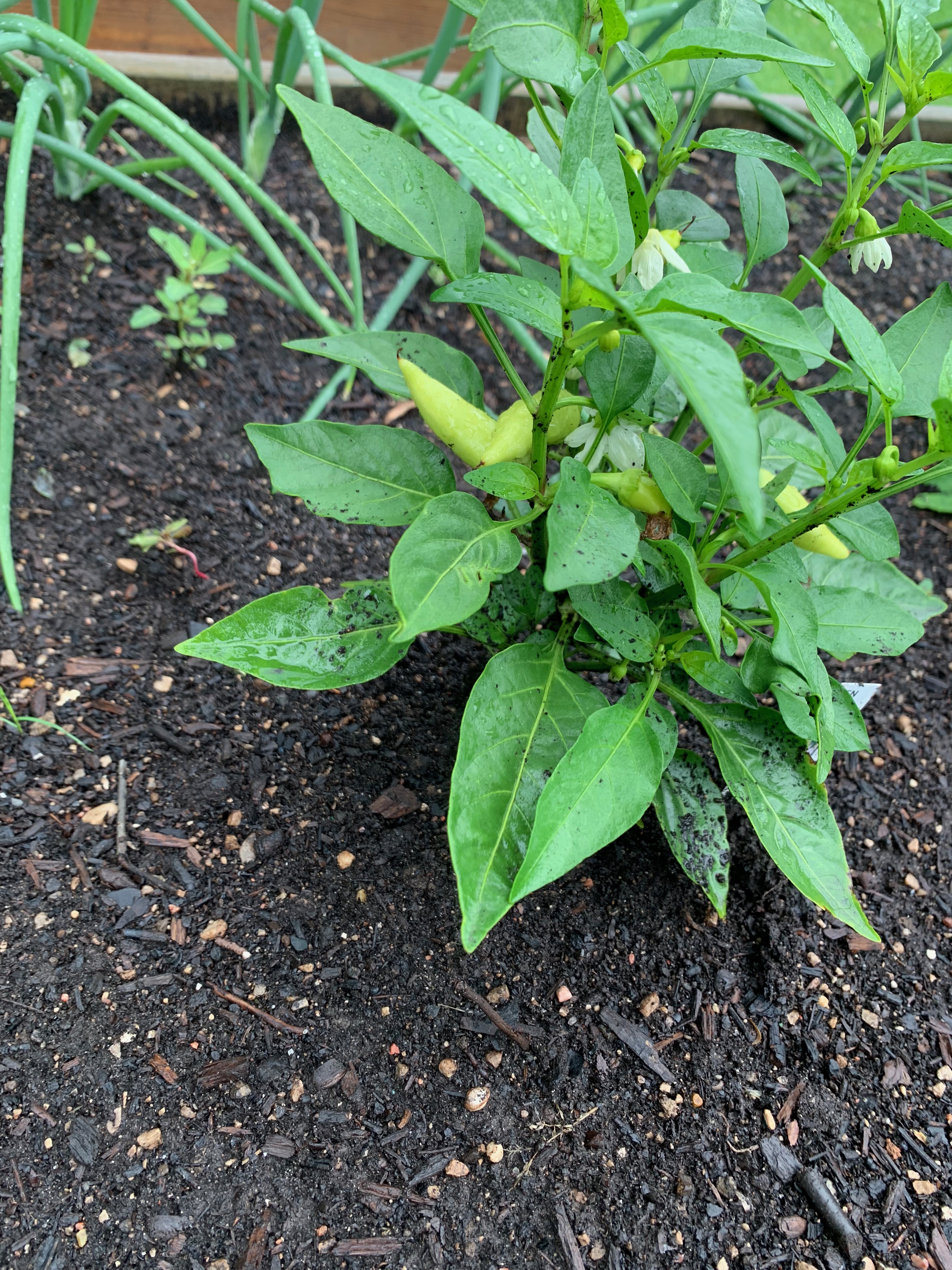 Every year I have to put in something different, this year it’s this, something that the label says is a “hot salsa pepper”. And that is literally all it says. I don’t know what variety or anything else about it. It is starting to produce pretty little yellow peppers, so that’s something. I picked one yesterday and tried it and it is most definitely not hot. Not by any standards. I’m not one of those people who loves peppers that make your face turn red and your eyes bug out and necessitate a trip to the ER because they’re so bad, but I do like a pepper that bites back at least a little. Jalapenos are about the limit of what I can handle for heat. But these, well, there’s just nothing there at all. Hopefully they’ll get better as they mature.