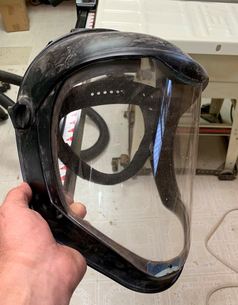 This is a full face shield from Honeywell Safety Products. This is generally what I wear. It can be easily worn over prescription glasses, protects the entire face, not just the eyes, and is far more comfortable to wear than the goggles are. And it’s easy to wear it over the top of most respirators, although it’s a tight fit over the top of a cartridge respirator. And it’s not real expensive. You’re going to pay under $40 for one like this. You can get better ones than this, at a higher price, of course. Some even come with air filtration systems, but those are a bit awkward to wear and damn they’re expensive.