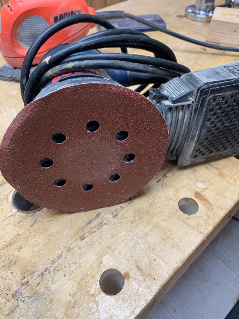 Despite the variety of sanders in that photo, IMO the only one you really need is an orbital sander like that Bosch up there. That’s really my workhorse sander. It uses sanding disks that attach with a hook and loop system, has holes in the disk that match holes in the sanding disks that permit it to suck up a lot, but not all, of the dust generated from sanding, and does a pretty good job of smoothing wood down. Discs are available in a wide variety of grades ranging from very coarse to very fine.