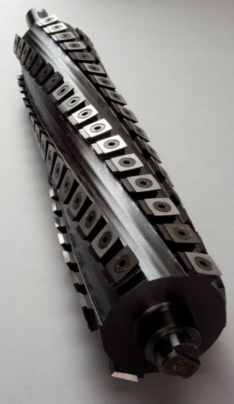 Sidenote: Helical cutters. For some years now helical cutter heads like the one over there on the right have been all the rage. Instead of straight knives running the width of the cutting head, you have the setup seen in the photo over there, rows of small, individual square carbide knives set into a helical pattern around the cutter head itself. The claim is that they do a better job than traditional straight knives, are quieter, take less power, and when they get dull, you just loosen the screw holding it down and rotate it 90 degrees to get a new edge. If you get one chipped, just rotate it or replace only that one cutter. In theory they look interesting. But my personal experience is that they don’t come anywhere close to living up to the hype. I’ll talk about these later. If I remember. I probably won’t.