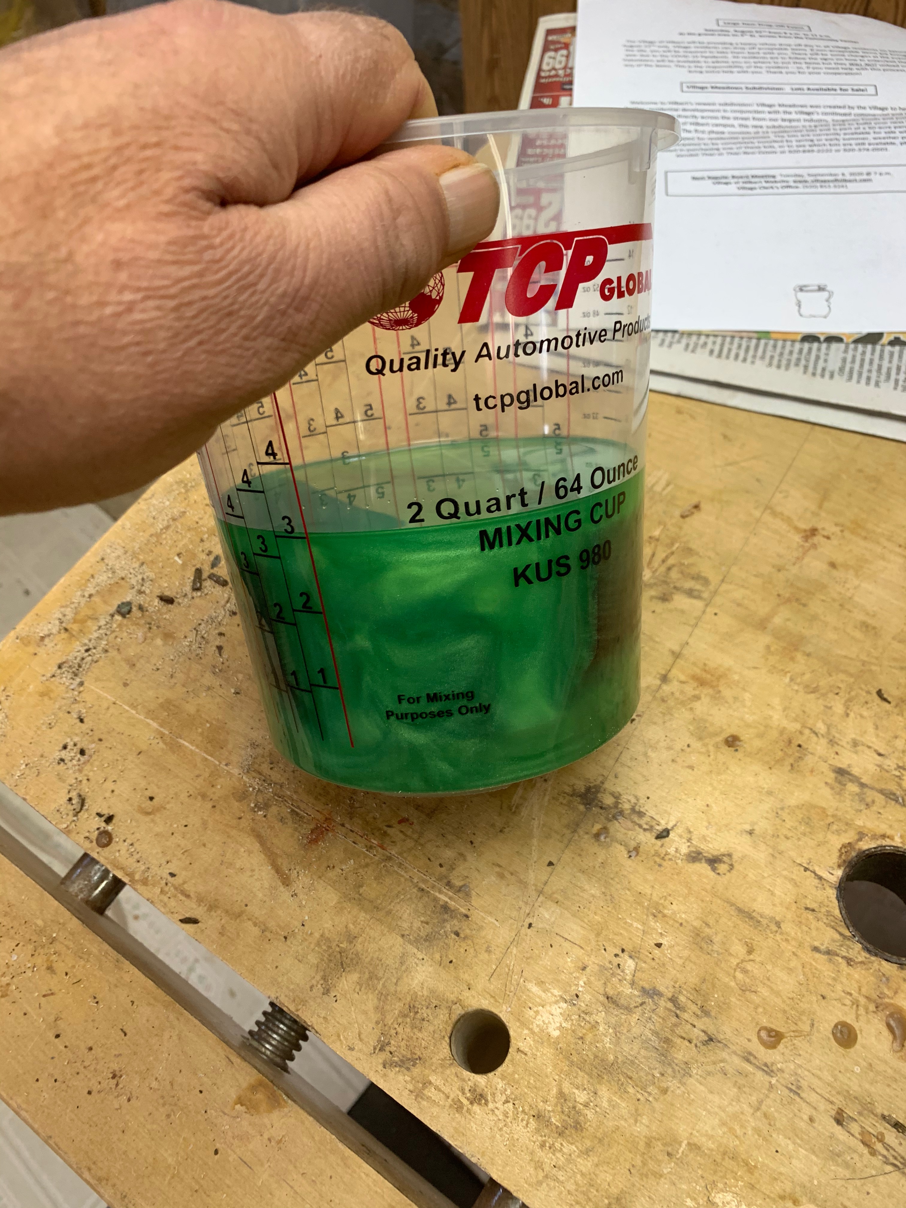 I really like the color on this one. It’s an iridescent emerald with a bit of bright yellow mixed in. It was in the pressure tank for 48 hours at 60 PSI to deal with bubbles and seems pretty clear as far as I can tell at this point. It’s nice and firm but a bit tacky to the touch so it needs to cure a while longer before I can start working with it.