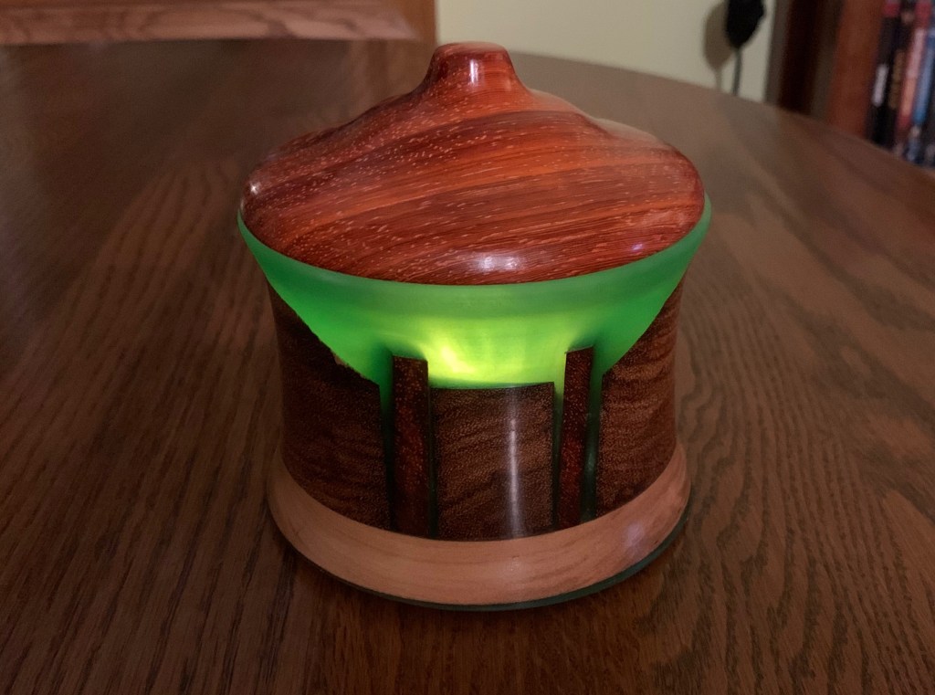 Of course there are exceptions. There always are. I’ve been talking about wood. When it comes to resin things are different. Resin is great fun to work with, but it presents its own unique challenges. One of my first resin experiments is over there on the left. The end result doesn’t look too bad, but lordy did I have problems getting it to that point because, frankly, I had no idea what the heck I was doing when I started messing with this stuff. I had to do considerably more work to get this little lamp smooth and scratch free, but in the end I still didn’t have to go to the extremes I’ve seen people go to on YouTube. This one was sanded to much higher grit than my wood projects, but only to 600 grit. And I did use a final abrasive paste/polish before putting a finish on it. But that’s it. I didn’t sand it up to 1,000 grit or more, didn’t wet sand it, didn’t do anything extraordinary. The wood parts were treated with my usual sealer, and the whole thing was topped off with a buffed coat of carnauba wax.